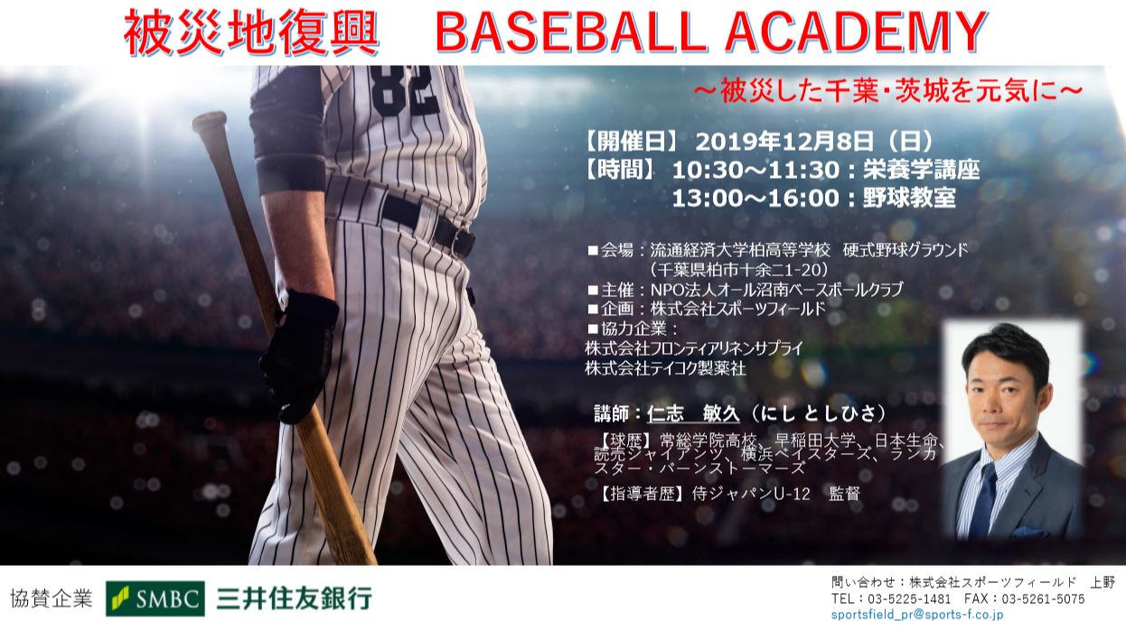 スポーツ人財の就職・採用支援サービスを手掛ける株式会社スポーツフィールド(本社:東京都新宿区 代表取締役:篠﨑 克志)は、2019年12月8日(日)に、流通経済大学付属柏高等学校グラウンド(千葉県柏市)にて開催予定の「BASEBALL ACADEMY 2019in千葉」を企画いたしました。