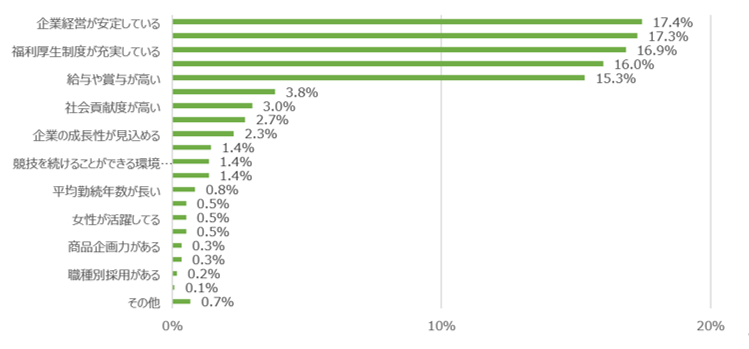 企業選択のポイントについて学生に質問をしたところ、17.4%の学生が「企業経営が安定している」ことが重要であると回答した。次いで、「社員の人間関係が良い」と回答した学生が17.3%となった。