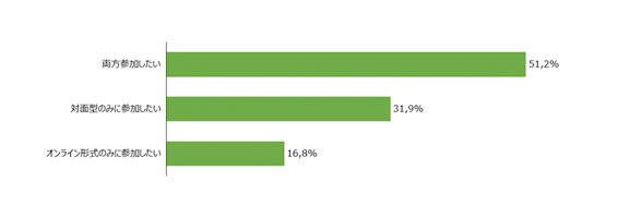【両方参加したい】と回答した学生が最も多かった。対面型に参加するメリットとして【社員の雰囲気が伝わること】が多くみられ、オンライン形式に関しては【感染症対策】や【効率性】という回答が多くみられた。