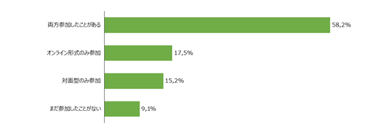 【両方に参加したことがある】と回答した学生が最も多く、全体の約58%となった。これまでに1回も参加したことがない学生については、全体の約9%となった。