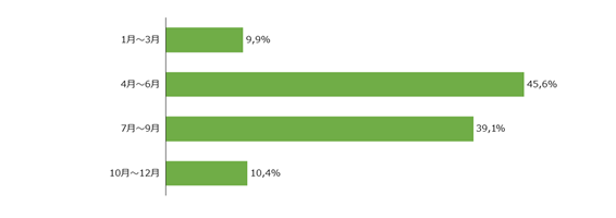部活動が最も忙しい時期について質問したところ、最も多かったのは【4月~6月】となった。 最も少なかったのは【1月~3月】となった。