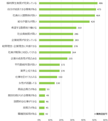 企業選択のポイントとして最も多かったのは先月の調査に引き続き、【福利厚生が充実している】となった。 次いで【自分が成長できる環境がある】と回答した学生が多くなった。