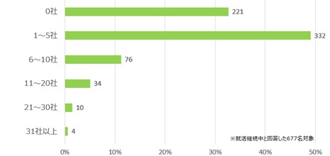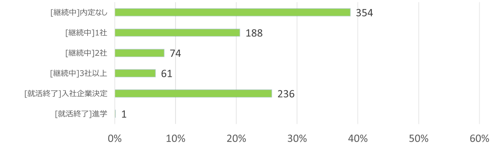 全学生に内定獲得状況を質問した所、全体の約61.2%の学生が【1社以上の内定がある】と回答し、そのうち25.8%の学生は【就職先が決定したため就職活動終了した】と回答した。しかし、内定獲得の有無に関わらず、5月上旬時点で【就職活動を継続している学生】は、全体の約74.1%となった。