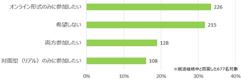 【オンラインのみ参加したい】と回答した学生が最も多かった。また、【希望しない】と答えた学生も32%あり、ある程度志望の企業が定まってきていることも読み取れる。