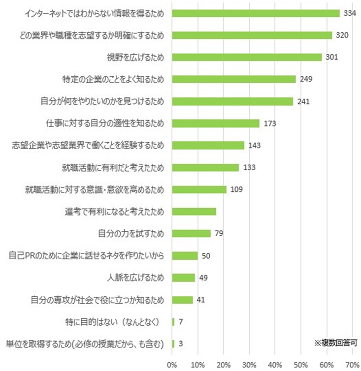 【インターネットではわからない情報を得るため】【どの業界や職種を志望するか明確にするため】と回答した学生が最も多く全体の約60%以上だった。次いで【視野を広げるため】の回答が約58%だった。