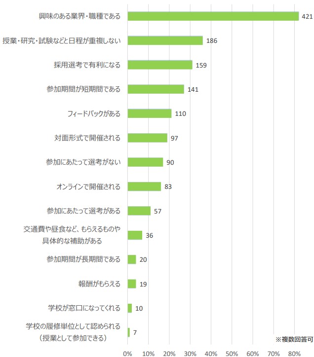 最も多かったのは【興味のある業界・職種】であり、2位の倍以上の回答数で全体の約82%だった。次いで【授業・研究・試験などと日程が重複しない】との回答が多く、日程調整も重要な項目であることが分かった。