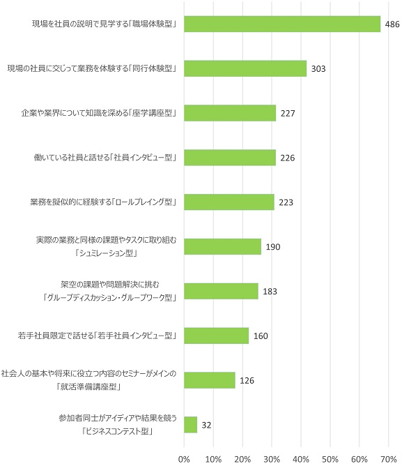 最も多かったのは【現場を社員の説明で見学する『職場体験型』】。次いで【現場の社員に交じって業務を体験する『同行体験型』】と、希望する形式の上位2項目が『体験型』となった。