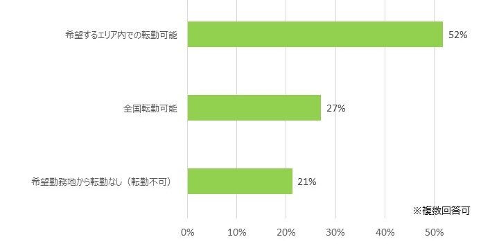志望する勤務地についての質問では、【希望するエリア内での転勤可能】と回答した学生が最も多く、52%だった。また、27%が【全国転勤可】と答えた。