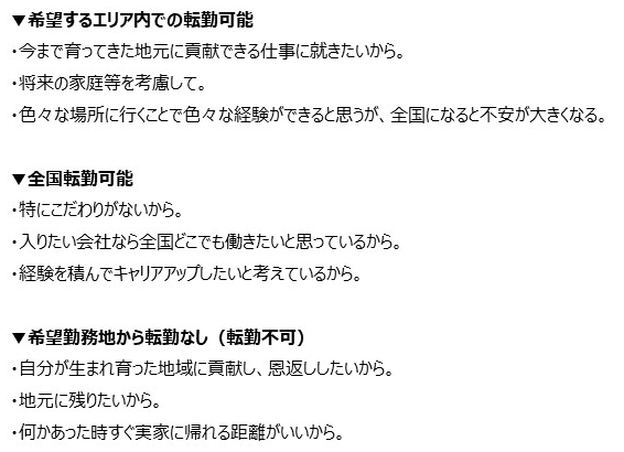 一方、転勤可能と答えた学生は、仕事内容やキャリアアップを重視する声が多かった。