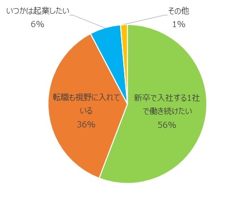 将来のキャリアについての質問では、 「新卒で入社する1社で働き続けたい」という回答が最も多く、全体の約6割となった。 「転職も視野に入れている」という回答は、36%であった。