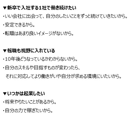 「新卒で入社する1社で働き続けたい」という回答では、「自分のやりたいことを続けたい」や「安定」を考える理由が多く上がった。