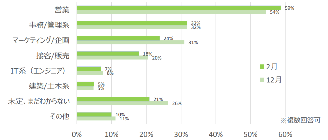【営業】を志望する学生が多く、次いで【事務/管理系】となった。12月よりも【未定、まだわからない】と回答した割合が減り、志望職種が定まってきていることがわかった。