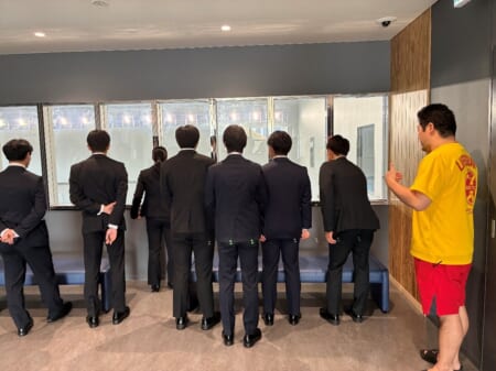 当日は、宮崎国スポを目指すアスリート等と、アスリート雇用に関心を持つ県内企業が集まり、企業の説明を聞いたり、質問したりするなど、熱心な様子が見られました。(画像左:説明会の様子・画像右:施設見学の様子)