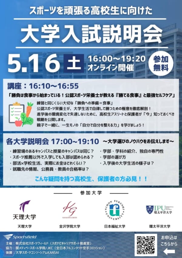 スポーツ人財の採用支援サービスを展開する株式会社スポーツフィールド(本社:東京都新宿区 代表取締役:篠﨑 克志)は、スポーツと学業の両立を目指す高校生および保護者を対象としたオンラインイベント「大学入試説明会」を2026年5月16日(土)に開催いたします。