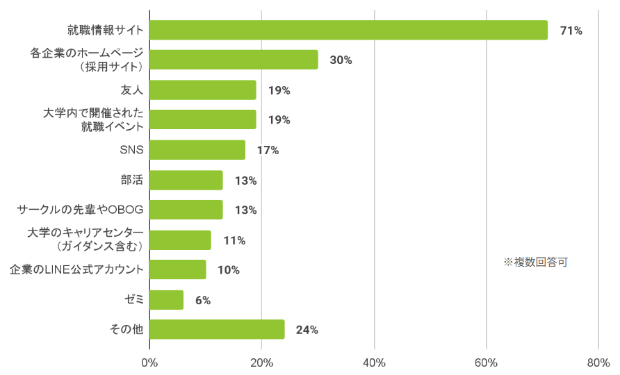 情報の入手元は【就職情報サイト(71%)】や【企業HP】が主流です。