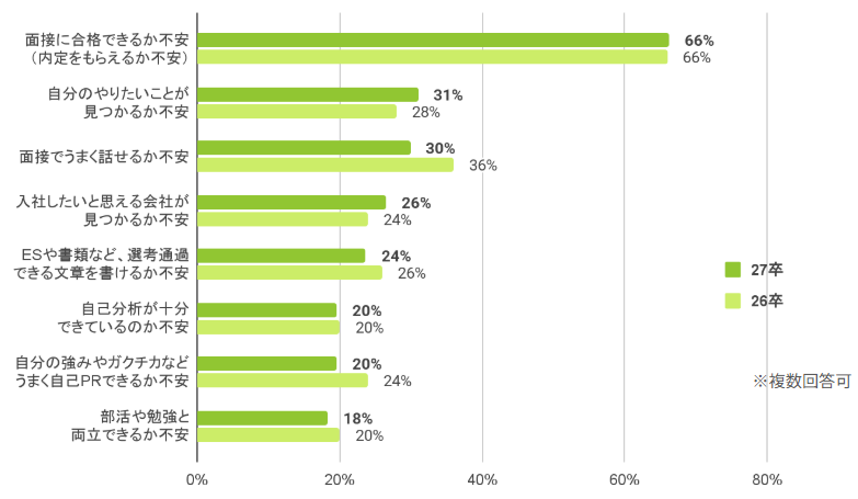 不安要素は【面接の合否(66%)】が最多ですが、対面スキルへの不安は前年より減少しています。
