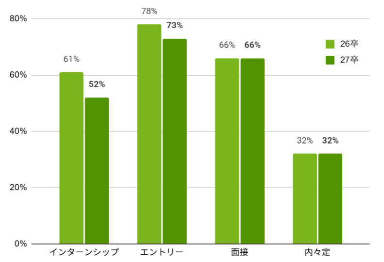 インターンやエントリーの経験率が低下する一方、面接や内々定の割合は同水準を維持しています。